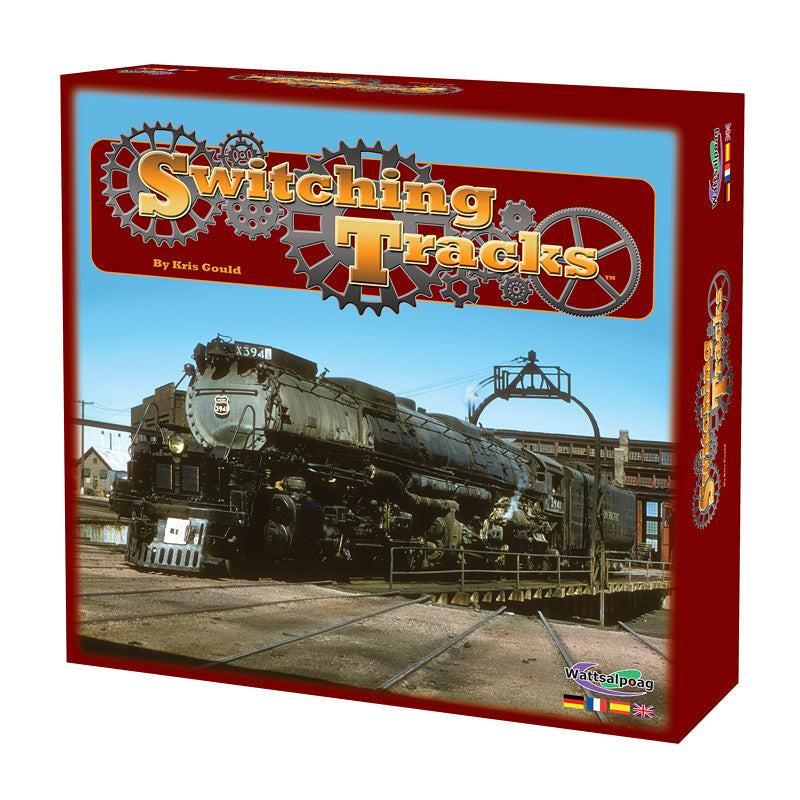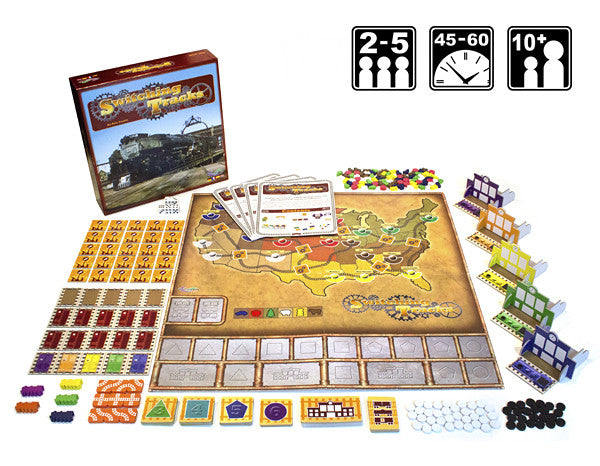 Switching Tracks is a pick-up-and-deliver style train game. The board shows railroad tracks and cities in the United States, with switch tiles at intersections, which can be changed to allow the trains to follow a different route. Goods are picked up in cities along the way and can be delivered to cities of the same color as the goods.